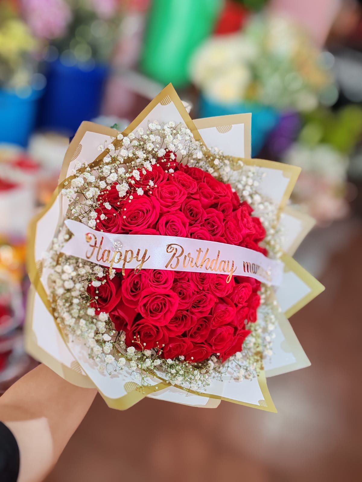 El ramo se complementa con un listón personalizado, ideal para añadir un nombre, mensaje o dedicatoria especial, convirtiendo este detalle en un regalo único y lleno de significado.