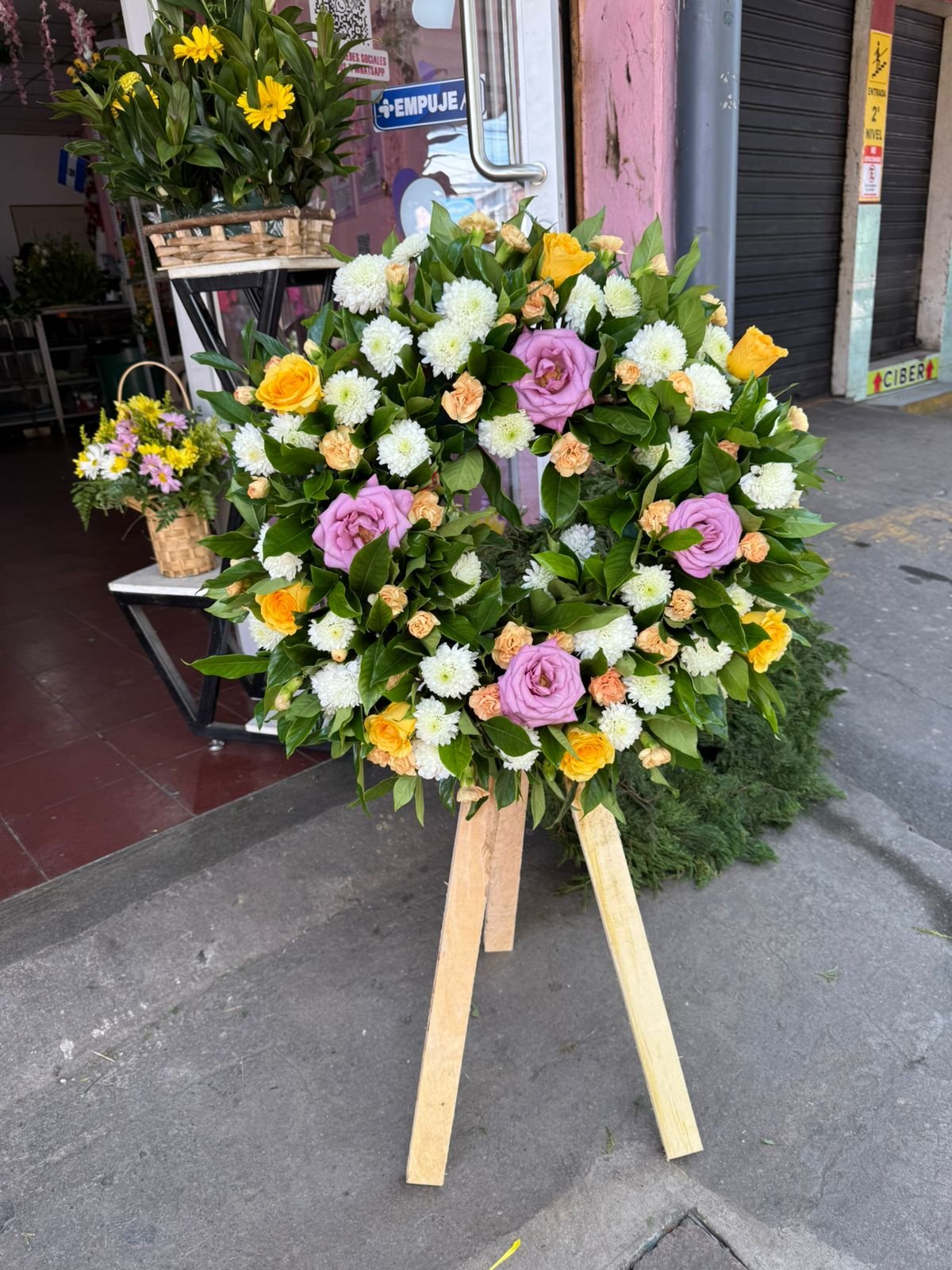 Montada sobre una base circular con caballete incluido, esta corona tiene aproximadamente una altura total de 65 cm y un diámetro de 40 cm, perfecta para expresar tus condolencias de forma sobria y significativa en ceremonias íntimas o espacios reducidos.